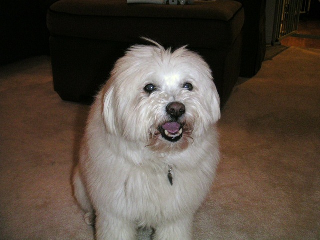 Over the next few months we kept him well groomed and well fed. We switched to a better brand of dog food (Innova) which he really ate up and we started feeding him some canned food too to make sure he was absorbing it all. As you can see, his fur grew out very nicely – soft and cushiony! What was more important however was the fact that he was SMILING. He started smiling and licking his chops whenever we would bring his ball out or his snacks. We did discover that his stomach was very sensitive and wouldn’t take certain types of snacks, but one thing was for certain: He was very well incented by food and he loved to play.