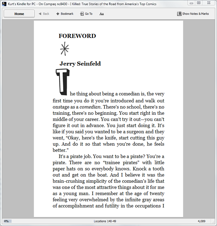 Most recently, I was on a long flight and I had my Kindle out, reading a particularly engrossing book called “I Killed: True Stories of the Road from America’s Top Comics“ about the stories comedians have collected while on the road going from city to city, and despite the low wattage consumption of the Kindle’s digital ink electronics, I was sternly told to immediately shut the device down because we were about to take off.  So for the next 20-30 minutes while we left the gate, puttered around the tarmac, and climbed to 10,000 ft, I was to be held captive to SkyMall?  Not me… printed chapter to the rescue!