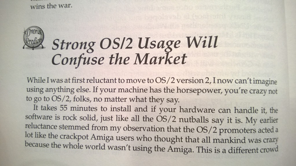 I grew up in both Silicon Valley as well as with Financial Services.  And I grew up in a IBM family to boot:  I knew only one guy that used OS/2.  And he was from IBM.  And he had the same technical religion around the product as Dvorak did – while ignoring the fact that things like developer ecosystem, hardware partnerships, marketing, and evolutionary transitions, all are equally important elements to the success of a product.